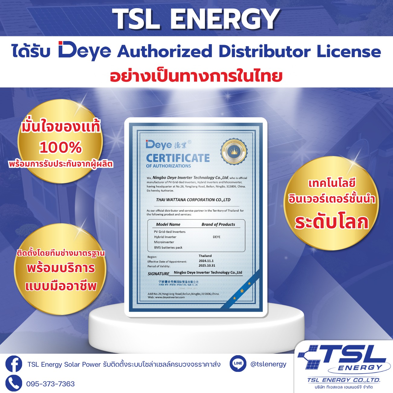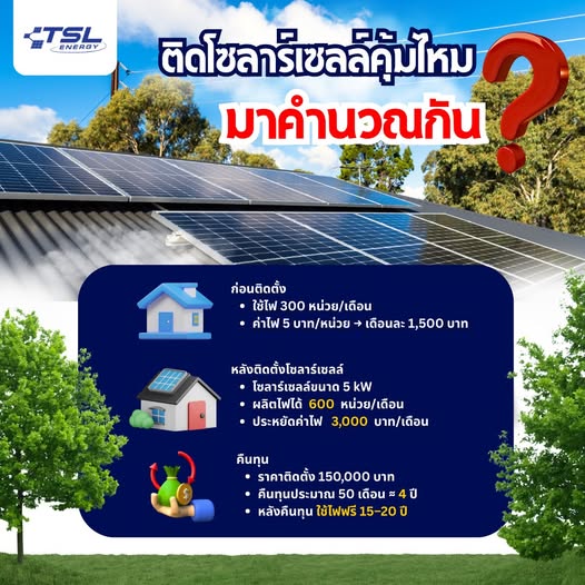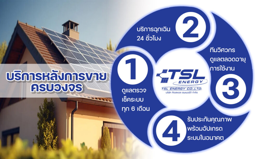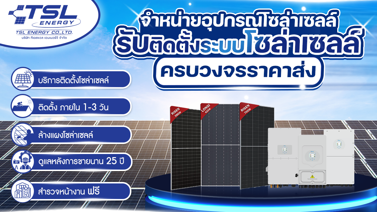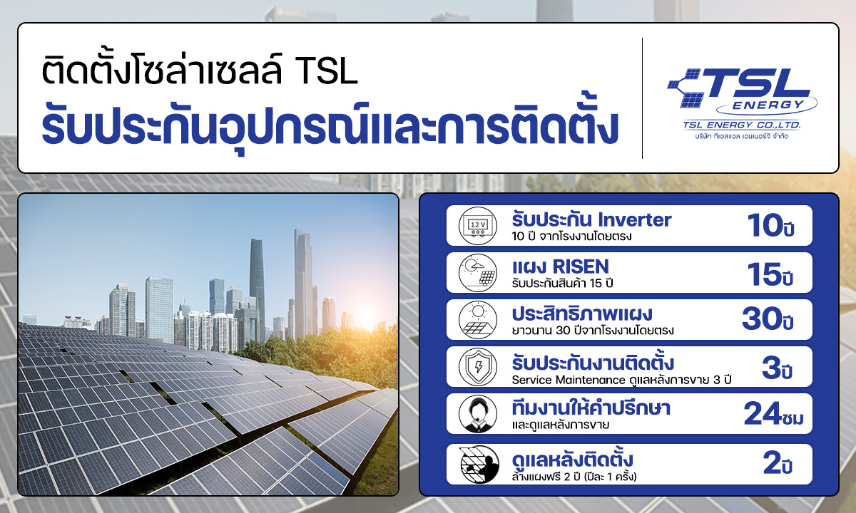 TSL Energy ดำเนินธุรกิจด้านพลังงานสะอาดและการติดตั้งระบบโซล่าเซลล์ครบวงจรมายาวนานกว่า 10 ปี ภายใต้เครือบริษัท ไทยวัฒนาคอร์ปอเรชั่น จำกัด ที่มีความมั่นคงและน่าเชื่อถือ บริษัทมุ่งมั่นในการส่งมอบโซลูชันด้านพลังงานแสงอาทิตย์ที่ช่วยให้ลูกค้าประหยัดค่าไฟในระยะยาว คุ้มค่าเพียงการติดตั้งครั้งเดียว